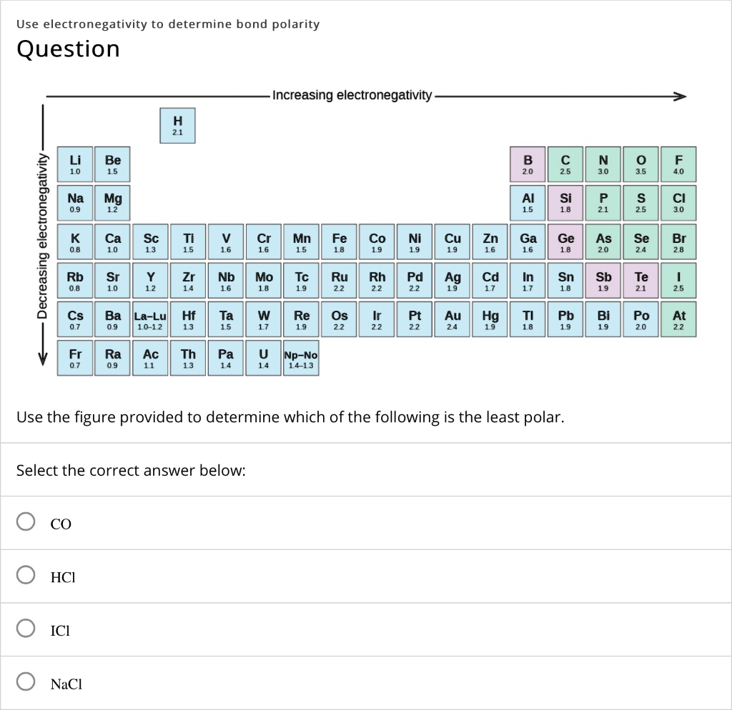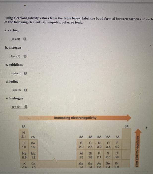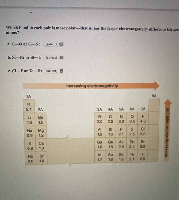 Solved Use Electronegativity To Determine Bond Polarity Question Increasing Electronegativity Be 1 Na Mg Al Si Ca Sc Cr Mn Fe Co Ni Cu Zn Ga Ge As Se Rb Sr Zr Nb