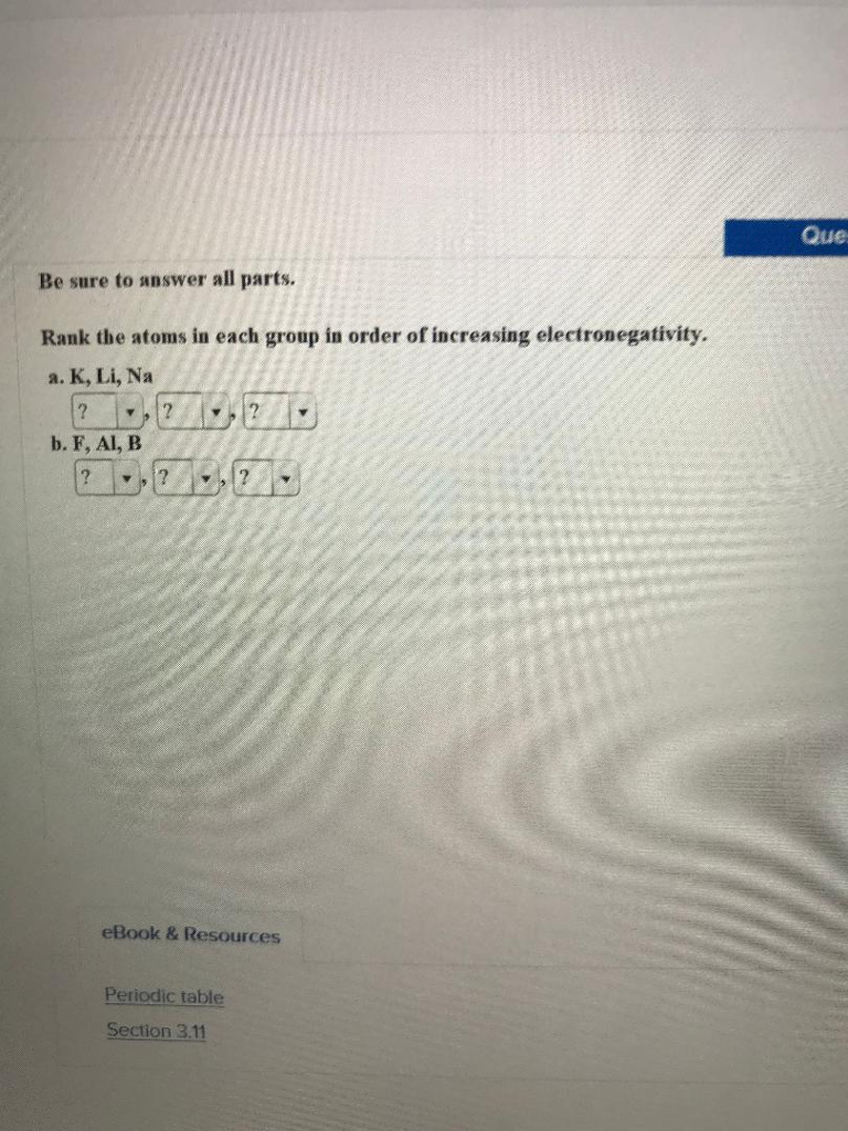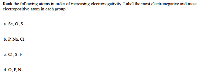 Rank the atoms in each group in order of increasing electronegativity. Chemistry questions and answers. You may want to refer to a periodic table for assistance.