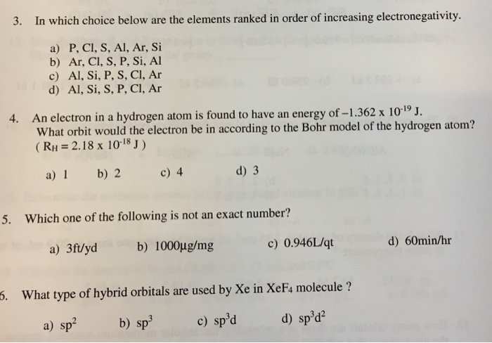 4 Arrange The Following In Order Of Increasing Electronegativity A Cl Br Se B Na Cs Homeworklib