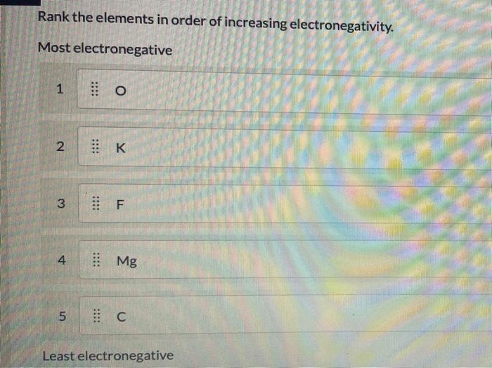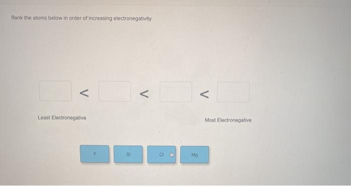 Rank the atoms below in order of increasing electronegativity Least Electronegative Most Electronegative F Si Mg CI. The increasing order of electronegativity is given below. Rank the atoms in descending order of the number of bonds that they commonly form.